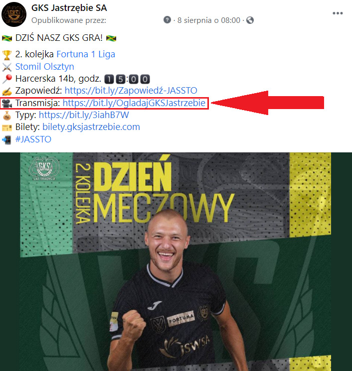 Wejdź na stronę transmisji poprzez LINK, który umieszczamy w tekstach poprzedzających mecze na naszej stronie internetowej, a także w social mediach, tak jak m.in. w tym przypadku: