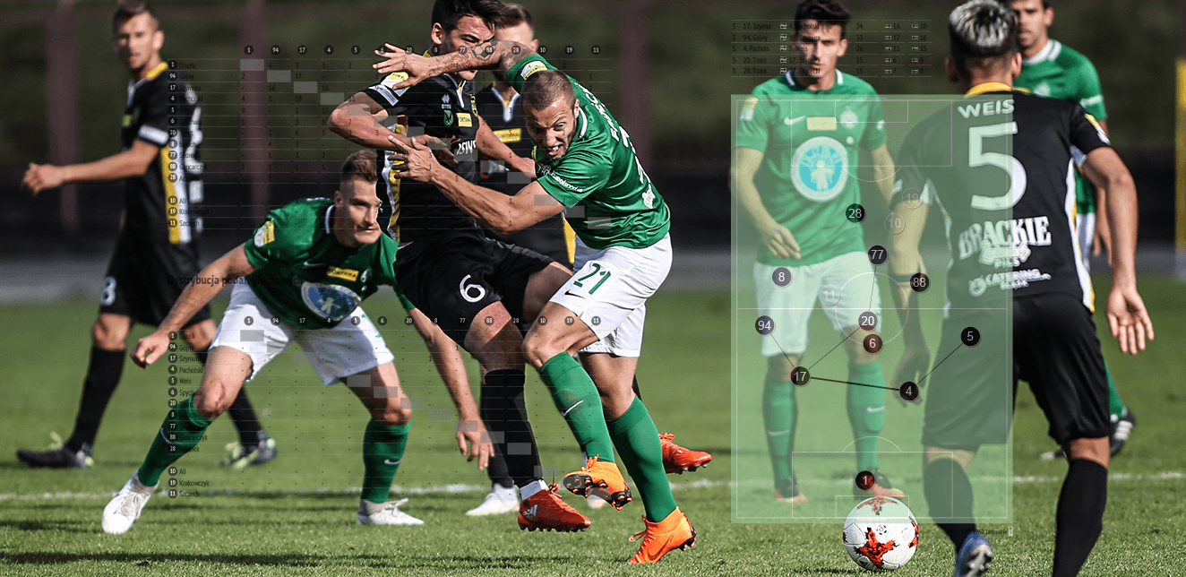 Najwięcej podań na swoim koncie miał Kamil Szymura. Wykonał ich aż 91, z czego 75 było celnych (82%). Z kolei najlepszą celność podań zanotował Dawid Weis (88%), podając celnie 50 razy na 57 prób.