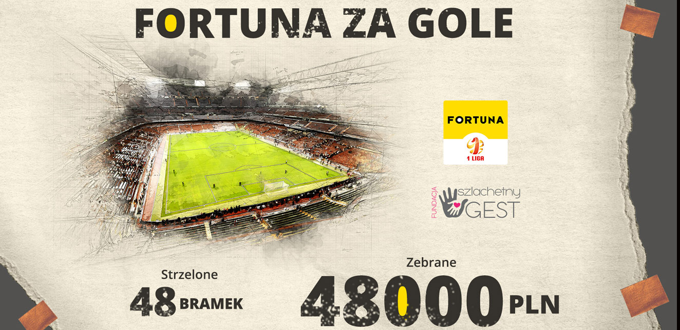 „Fortuna Za Gole” to już trzecia pod tą postacią akcja charytatywna organizowana przez bukmachera. W rundzie wiosennej poprzedniego sezonu Fortuna przekazała darowiznę w wysokości 69 000 zł Fundacji Doliczony Czas na leczenie Łukasza Derbicha i Karola Hodowanego. Tak wysoką kwotę udało się uzyskać dzięki rekordowo strzelonej liczbie bramek, jakie padły na pierwszoligowych stadionach.