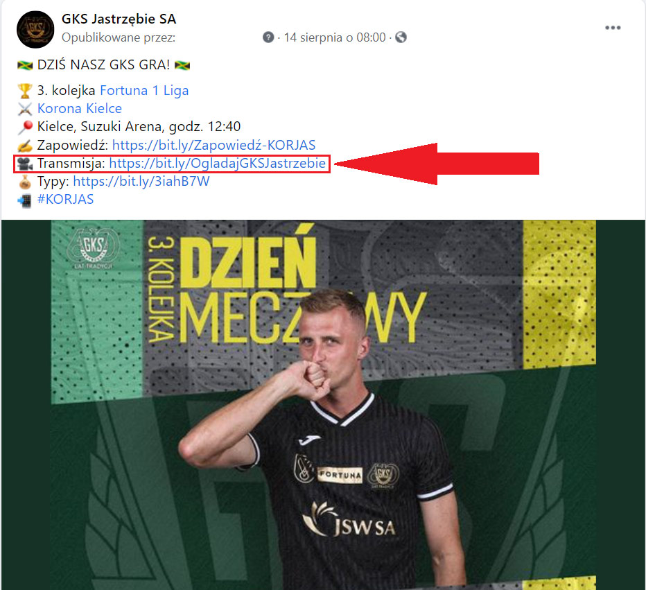 Wejdź na stronę transmisji poprzez LINK, który umieszczamy w tekstach poprzedzających mecze na naszej stronie internetowej, a także w social mediach, tak jak m.in. w tym przypadku: