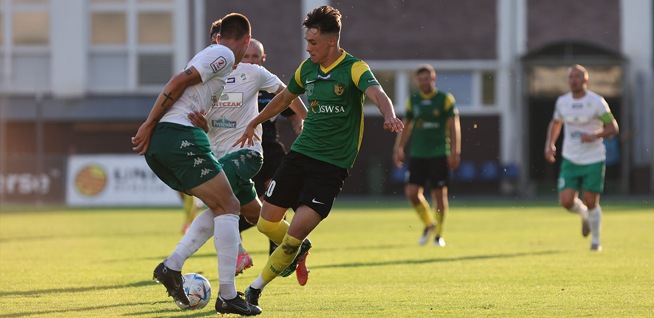 W meczu 6. kolejki eWinner 2. Ligi remisujemy przy Harcerskiej z KKS-em Kalisz 1:1. Gola dla naszego zespołu - pierwszego w zielono-czarno-żółtych barwach - zdobył na początku drugiej połowy Szymon Gołuch.